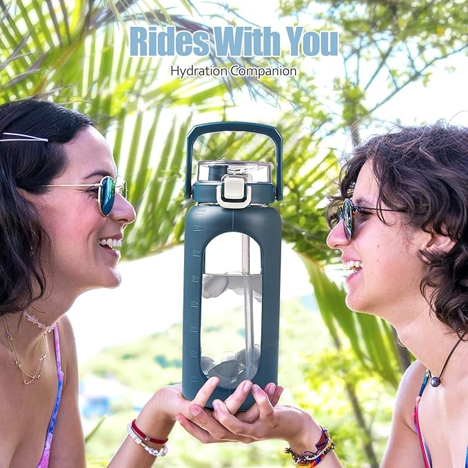 - LARGE CAPACITY WITH TIME MARKER: BLUEGO glass bottle has 64oz capacity with rubber sleeve TIME MARKER and water capacity markers. The clear and see-through window help you to track the amount of water you drink, always keeping you hydrated. Meanwhile the water bottle lid with a sealing cap that effectively prevents any leakage.