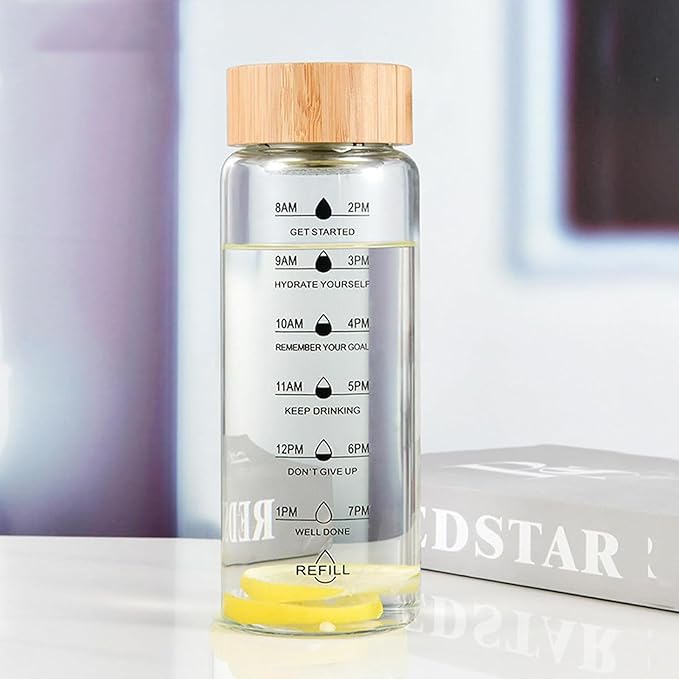 - 25oz large capacity: The glass water bottle with time stamp has a large capacity of 25oz, which is suitable for most people's daily water intake. The wide mouth opening is easy to fill with water, ice cubes or fruit, and the leak-proof lid is convenient to carry.