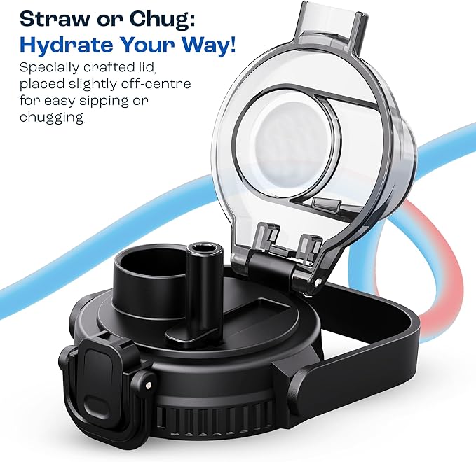 - 2-in-1 Chug & Straw Lid - Our half gallon water jug comes with a dual functionality lid that allows you to chug or sip without having to change the lid. The smart, off-centre placement of the lid lets you use both the spouts with ease - sip while you work and chug after a rigorous workout!