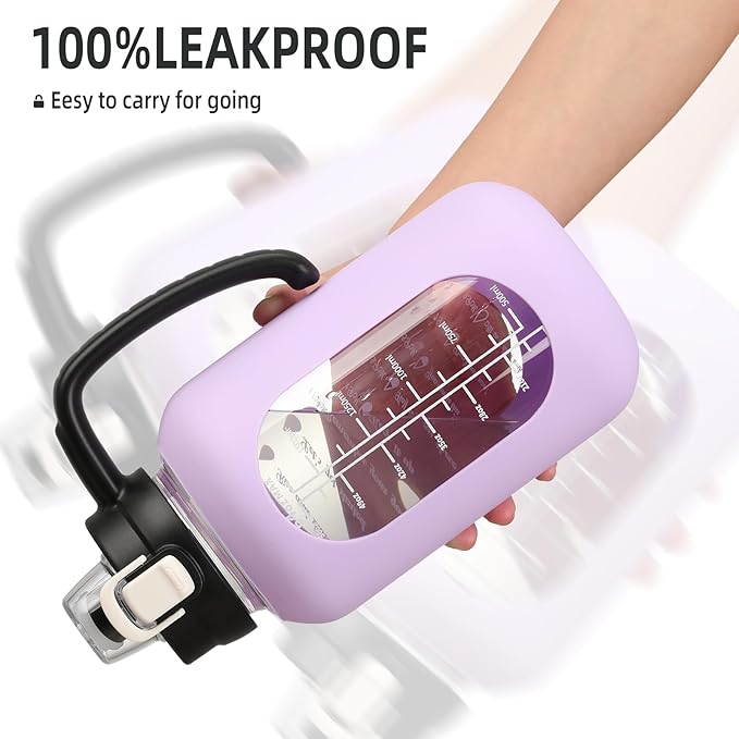 - 【Glass Water Bottle with Silicone Sleeve】Olivego big water bottle for easy to carry and use. The half gallon water bottle with straw has an anti-slip and high quality silicone sleeve to protect the glass water bottle and help prevent it from being slippery in your hands or slight bumps.The handle ensures a firm grip & our wide mouth flip cap spout makes pouring easy & smooth.