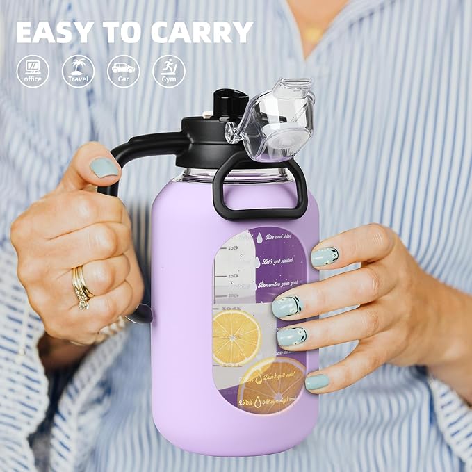 64 oz Glass Water Bolttles Half Gallon Large Motivational Water Bottle with Time Marker Sports Water Bottles with Silicone Sleeve and Handle Lid Water Jug for Gym Workout-1 Pack