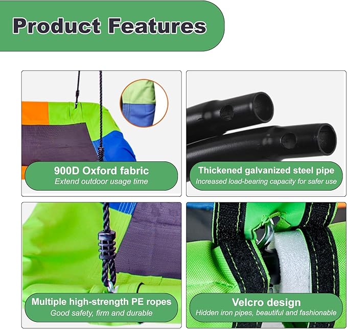- ✔[Safe to use ]: Constructed of 900D Oxford fabric, a steel frame, and foam padding, our swings are weather-resistant and built to withstand years of outdoor use. In addition, the swing features an upgraded galvanized alloy frame, multi-strand braided ropes and metal rings for fastening, all designed to keep kids safe.