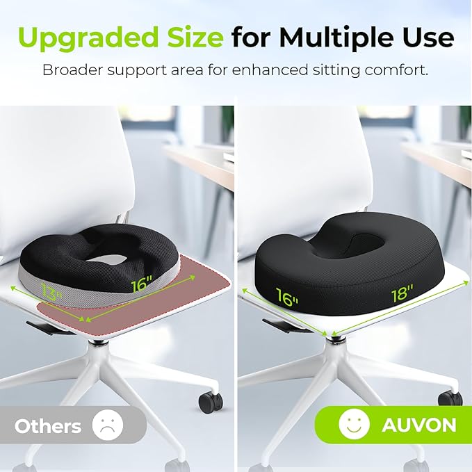 - Innovative Composite Materials for Balanced Support & Softness: AUVON's team conducted a market research on seat cushions and innovated this donut cushion with a new combination of soft-cloud and extra support memory foam for ideal balanced comfort. The soft layer cradles your legs, while the support layer offers medium support without flattening. It features a U-shaped gap to relieve tailbone pressure when sitting longer. (For blood circulation, please stand up for 10 minutes every hour.)