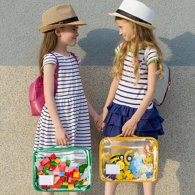 4 Pack Toy Storage Organizer Bag for Lego Bricks, Clear PVC Zippered Blocks Set with Manual Pocket& Name Tag, Waterproof Toy Carrying Case for Board Games& Building Blocks (Large, Colorful)
