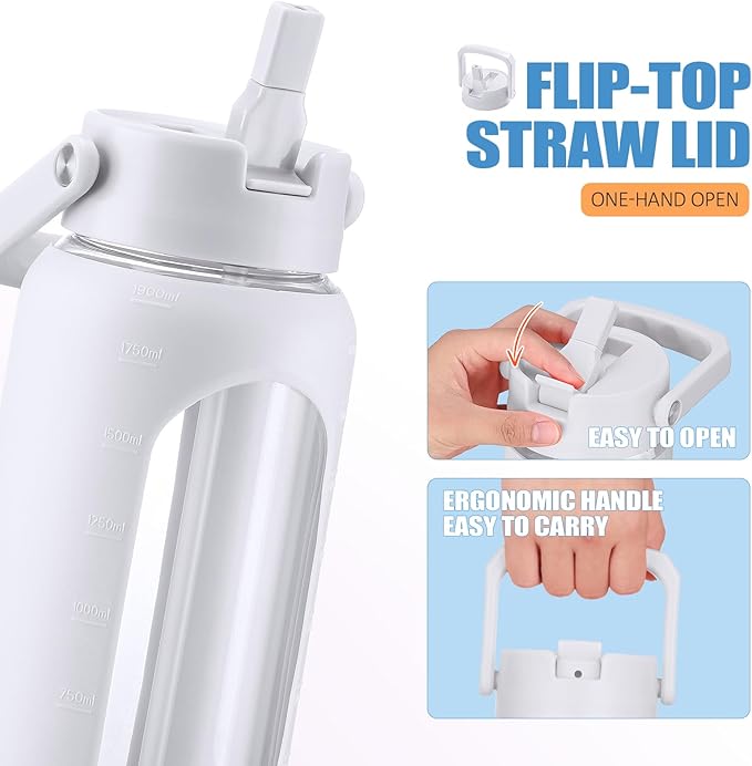 - MOTIVATIONAL TIME & VOLUME Marker: With inspirational TIME and VOLUME marker, the 64 oz glass water bottle can remind you of your goals of drinking all days.2 liters large capacity allow you not to refill it frequently any more. That is equivalent to 8 cups of water,suggested by scientists for human drink per day, helps you stay hydrated and daily healthy.