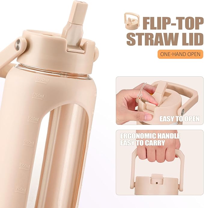 - TWO LIDS DESIGN: Our motivational glass water bottle boasts 2 lids, a flip lid and a spout lid, to meet your various needs of drinking on different occasions and making you get 2 bottles with 1 bottle’s cost.