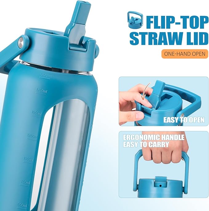 - MOTIVATIONAL TIME & VOLUME Marker: With inspirational TIME and VOLUME marker, the 64 oz glass water bottle can remind you of your goals of drinking all days.2 liters large capacity allow you not to refill it frequently any more. That is equivalent to 8 cups of water,suggested by scientists for human drink per day, helps you stay hydrated and daily healthy.