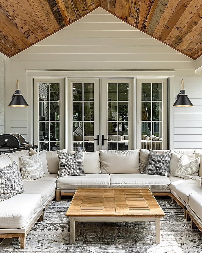 - 【Modern Design】 This single wall lamp compliments the look of almost any indoor or semi-outdoor space, matte black finish decored with brushed gold, the brass interior reflects the light to form an extremely accent contrast. (Attention: Moisture-proof but not waterproof, please keep it away from water)