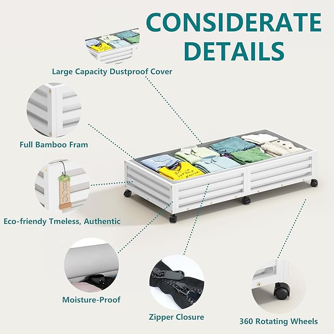- 👍[Sturdy and Durable] Our under bed storage with wheels is crafted from premium wood bamboo, boasting 4 rotating wheels and a capacity of 120lbs. This 'under bed storage' solution includes non-woven bags for efficient organization of clothes, books, shoes, and toys.