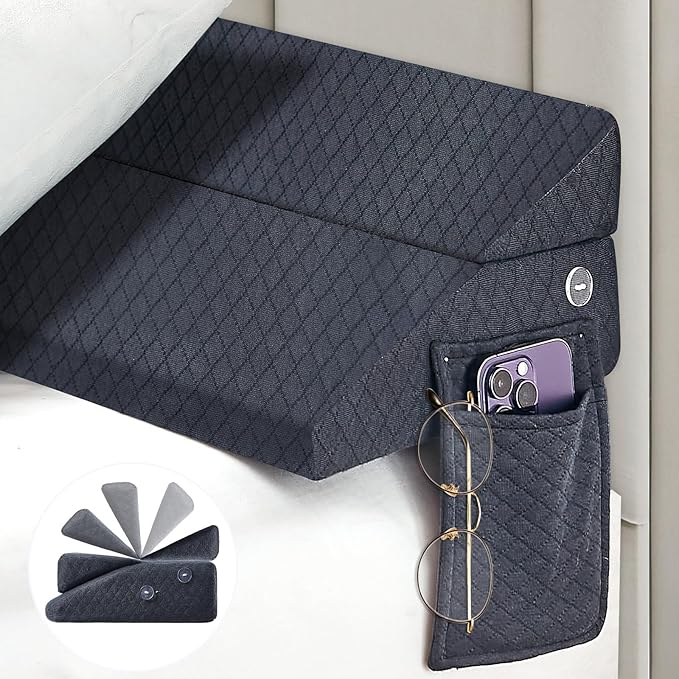 - 【SIDE STORAGE POCKET】For a tidy and convenient sleeping space, the mattress wedge gap filler with 2 storage pockets on each side, secured with buttons. You can put the remote control, phone, glasses and other small things into the pocket of pillow wedge for headboard gap, and you can use it whenever you need it, without getting up to look for something.