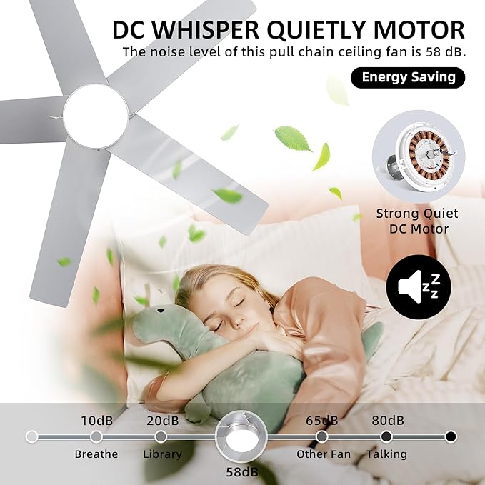 - 【WHISPER QUIET CEILING FAN】The high cfm ceiling fan delivers 4040CFM as the max airflow at the highest speed. The reversible blades silver ceiling fan is noiseless and lower than 55dB, without hum or wobble. The DC pull chain ceiling fan is friendly for light sleepers which will bring you a comfortable sleep and a quiet living environment, not only suitable for families with babies but also for the elderly.