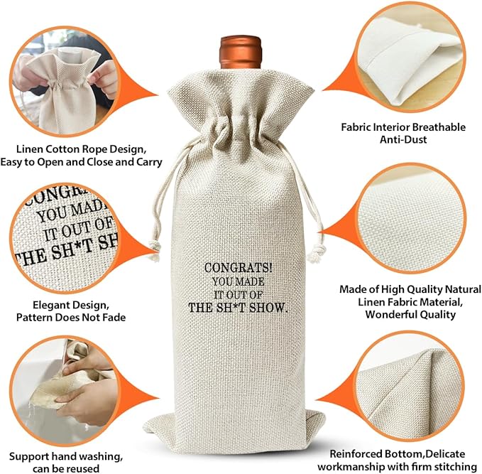 - PREMIUM MATERIAL: Our funny wine bag is made of high-quality cotton linen material fabric, printed double-sided, odorless, smooth appearance, durable and reusable. At the same time, it has very good quality and safe enough to protect or hold wine or champagne bottle.