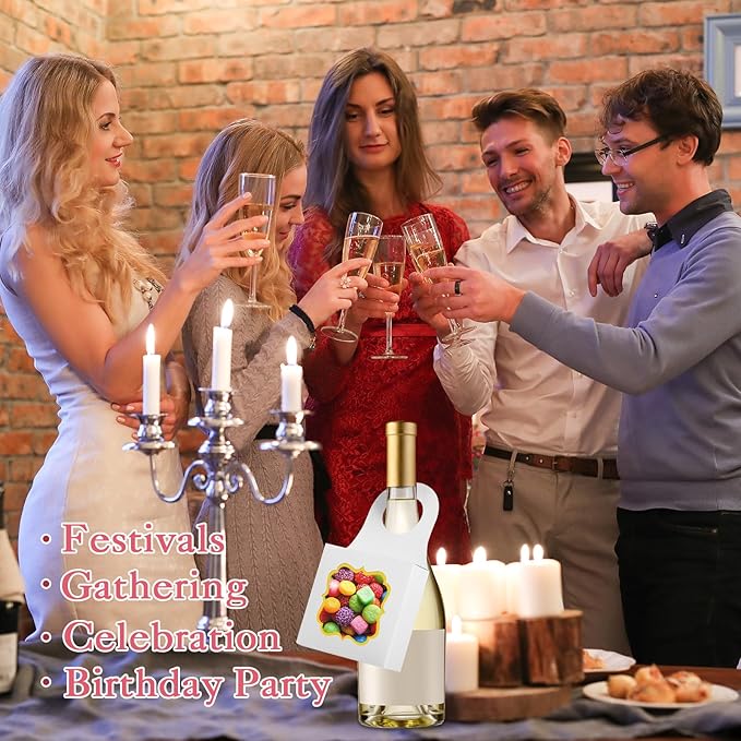- UNIVERSAL SIZE - Wine bottle hanging boxes are 3.5 x 3.5 x 1.2 inches / 9 x 9 x 3 cm in size, and the hanging hole size is 1.5in / 3.8cm. Thick cardboard material makes gift box with window durable and easily to hang on various size glass bottles such as champagne, prosecco, beers, and also plastic bottles like soda and water bottle.