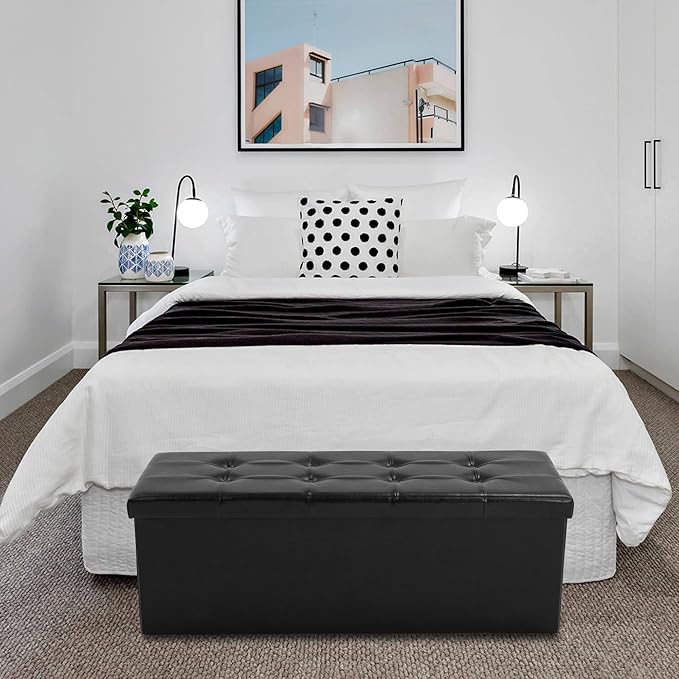 43 Inches Folding Storage Ottoman Bench, PU Leather Storage Chest, Footrest Padded Seat for Bedroom and Hallway, Holds up to 660 lbs, Black