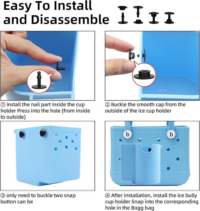 - 【Easy To Use】Button installation - simply thread the nail through the hole of the bogg cup holder and Borg bag, and then fasten the button. Stable installation without vibration or falling-off dangers. Suggested installation location: The third and fourth rows of holes from top to bottom are the best