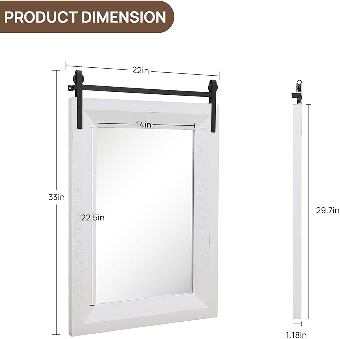 - 【Premium Solid Wood Frame】The frame of the farmhouse mirror is made of premium fir wood with oil-based paint to prevent scratches and ensure durability and resistance to moisture. The solid wood frame gives the rustic mirror a sturdy and authentic look, adding a touch of farmhouse appeal to the bathroom, living room, powder room, entryway, hallways, bedroom, dressing room, garden, courtyard, etc.