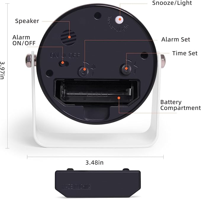 - Compact & Portable - This small, round alarm clock measures just 1.6 x 1.4 x 1.4 inches and weighs a mere 7.8 oz. Perfect for compact spaces like nightstands and desks, and portable enough for travel. Operates on one AA battery (not included).
