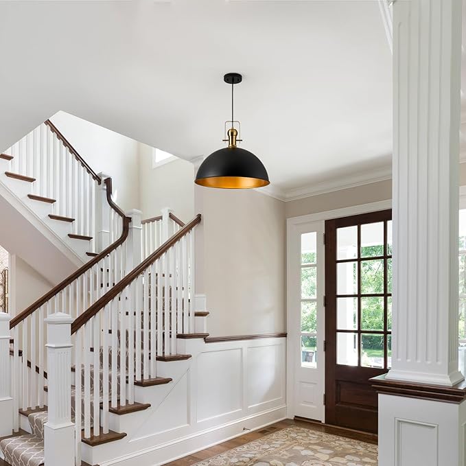 - [Industrial & Vintage Design]: 2-Light industrial farmhouse pendant light fixtures with adjustable cord, mattle black finish featuring retro-style dome shade, this antique pendant lighting is made of sturdy metal construction in black finish and inner gold finish.The vintage pendant lights is ideal for home, dining room, kitchen island, warehouse, entryway, corridor, restaurant, cafe, bar, club, barn, working bench.