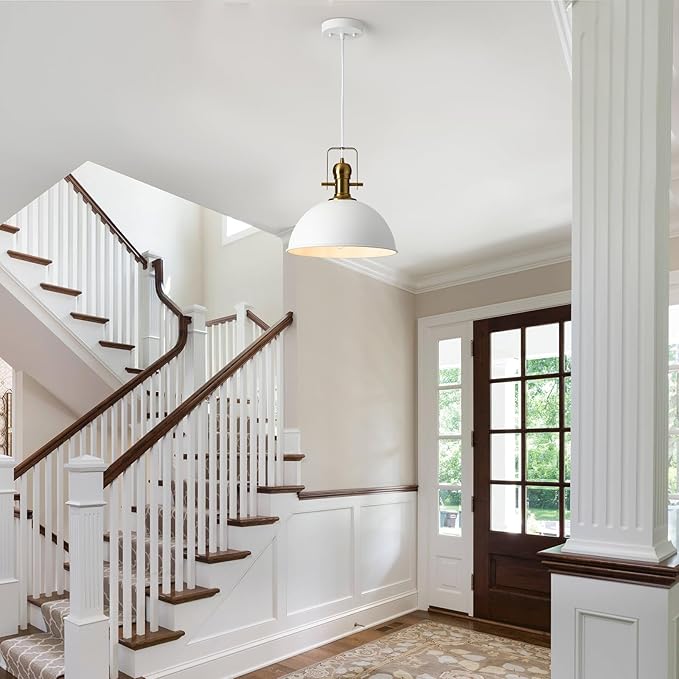 - [Industrial & Vintage Design]: 1-Light industrial farmhouse pendant light fixtures with adjustable cord,white finish featuring retro-style dome shade, this antique pendant lighting is made of sturdy metal construction in black finish and inner gold finish.The vintage pendant lights is ideal for home, dining room, kitchen island, warehouse, entryway, corridor, restaurant, cafe, bar, club, barn, working bench.