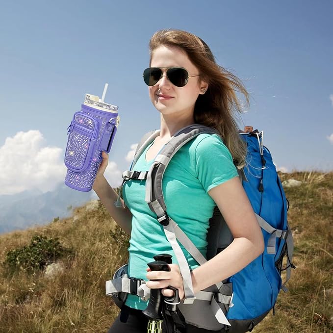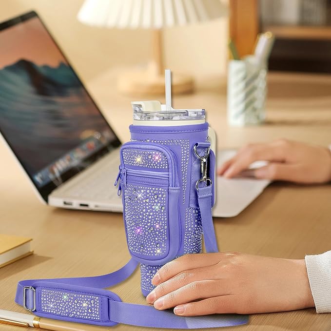 Bling Water Bottle Carrier Bag with Phone Pocket,Water Bottle Holder Bag for Stanley Cup Accessories,Cup Holder with Adjustable Shoulder Strap with Stanley 40 & 30 oz Tumbler,Purple