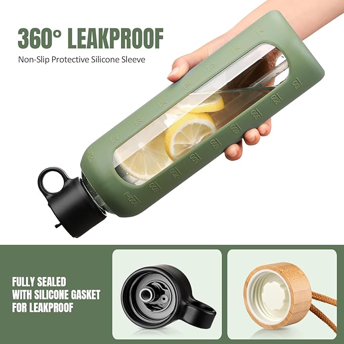 32oz Glass Water Bottle With 2 Lids-Flip Straw Lid, Bamboo Lid, Glass Water Bottle With Silicone Sleeve, Motivational Time Marker, Glass Juice Bottle for Cold Drink,Plive