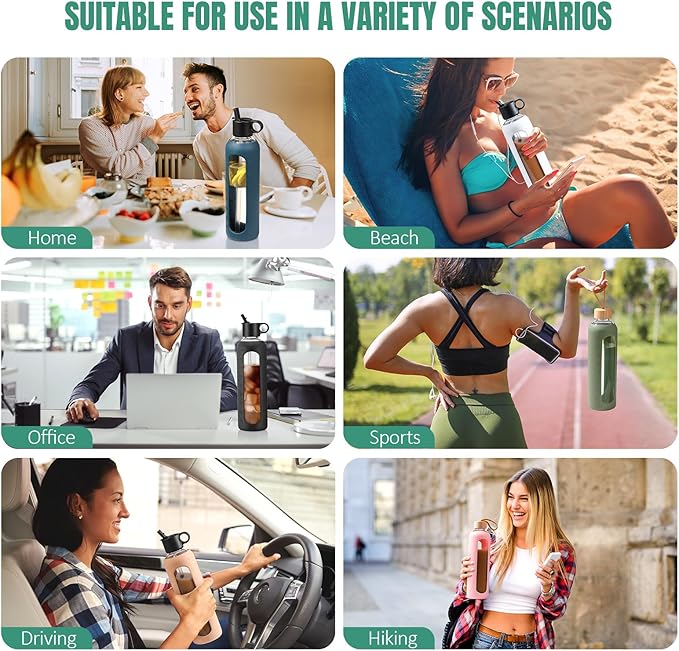 - MULTIPLE OCCASIONS -WINSA glass water bottle with straw is ideal for both daily inhouse or outdoor occasion, such as Home, work office, sports, gym, beach, hiking, camping or driving. Great present option for friends or families on School, Thanksgiving, Xmas, Birthday, Anniversary, etc. Our glass water bottle come with both 24oz and 32oz, each with 8 trendy colors and all have interchangeable 2 lids making this your ultimate drinking companion!