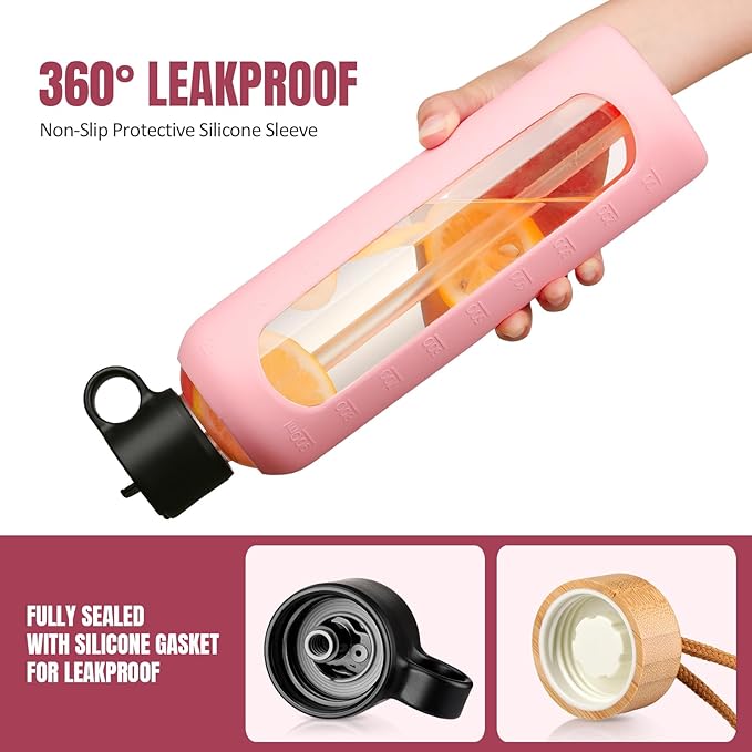 32oz Glass Water Bottle With 2 Lids-Flip Straw Lid, Bamboo Lid, Glass Water Bottle With Silicone Sleeve, Motivational Time Marker, Glass Juice Bottle for Cold Drink,Pink