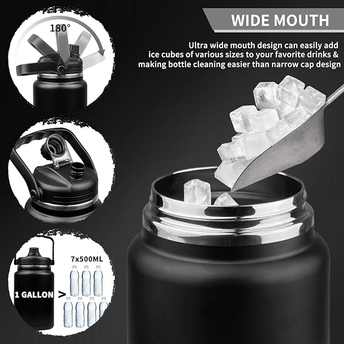 - 【Wide Mouth Water Bottle】: Our large water bottle features a ultra wide mouth design with a mouth diameter of 4.57 inches, allows ice cubes of all sizes to be easily added to your favorite beverage. And our wide mouth is easier to clean bottles than the narrow lid design.