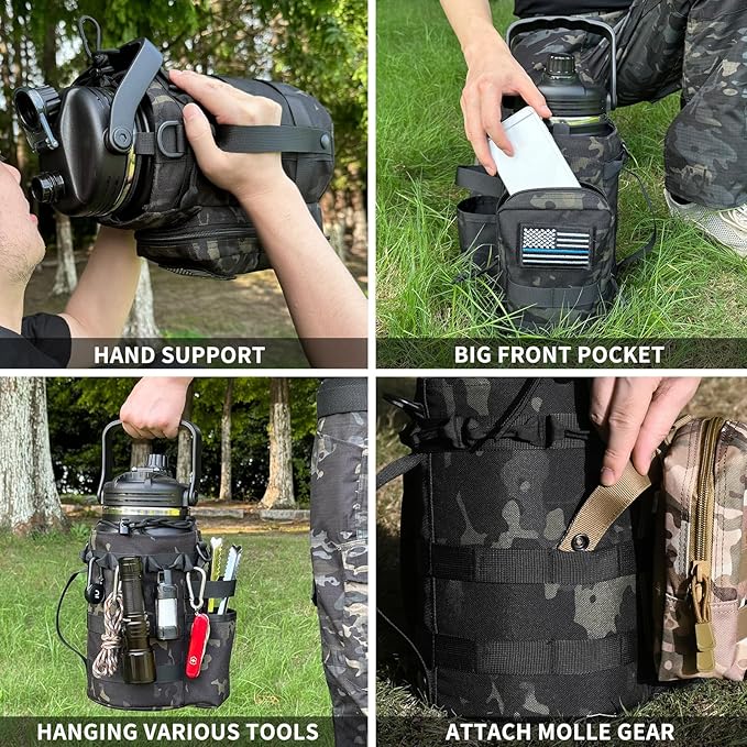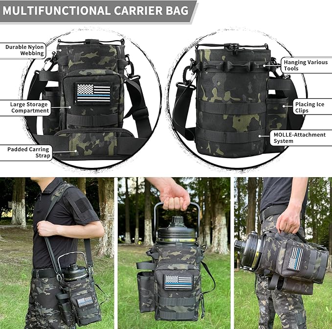 - 【Tactical Bag For Easy Carring】:Our water bottle holder is made of double-layer polyester and insulating Oxford cloth, which provides protection for the water jug. The water bottle bag also adds warmth, making it more effective in maintaining cold or hot. It has a detachable shoulder strap for carrying and a hand support strap on the side for easy pouring of water. Water bottle carrier bag has MOLLE webbing attachments and a large storage compartments for your phone, keys, wallet and more.