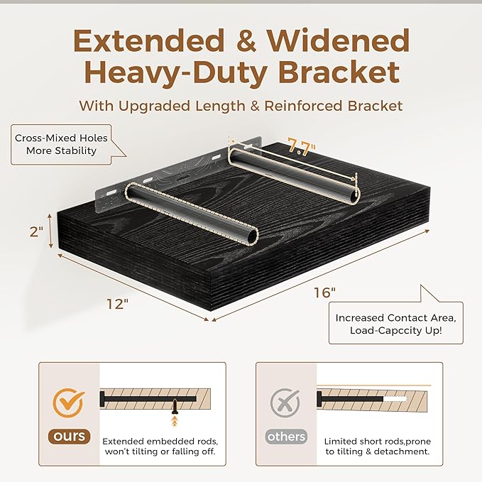 12 Inch Deep Black Floating Shelves, 16 x 12 Floating Shelf for Books, Rustic Wood Deep Wall Shelves for Home Storage & Display, 2" Thicked Shelves for Kitchen, Living Room, Bedroom, 2 Pack
