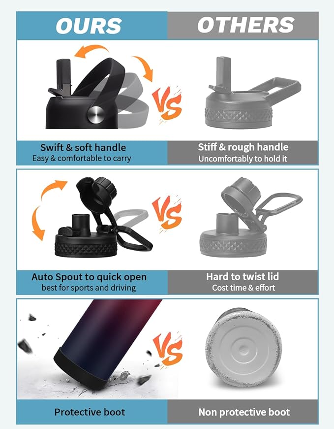 - DRINK WATER ON YOUR WAY: This stainless steel water bottle includes 2 leak-proof lids - 1 straw lid and 1 auto-spout lid - to meet your different drinking needs. The pop-up spout lid is designed for one-handed opening and closing, with a large water outlet for fast drinking. The spill-proof straw lid makes it easy to sip on the go, great for all your outdoor adventures, and also prevents you from inhaling ice cubes.Both are fitted with silicone rings to prevent any spills or leaks.