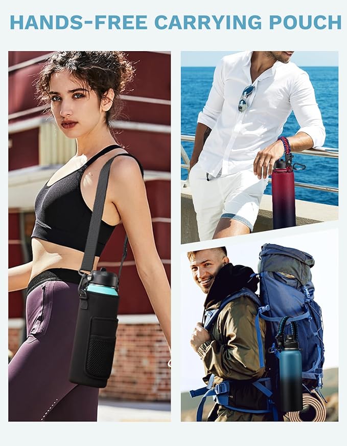 - HANDS-FREE BOTTLE CARRIER BAG & PROTECTIVE BOOT - Metal water bottle with hands-free shoulder carrier bag that features 2 storage pockets for your phone, cards, and keys, and the shoulder carrier pouch also provides extra insulation. The silicone protective boot fully protects the reusable water bottle from additional damage and prolongs the life of the thermo water flask bottle.