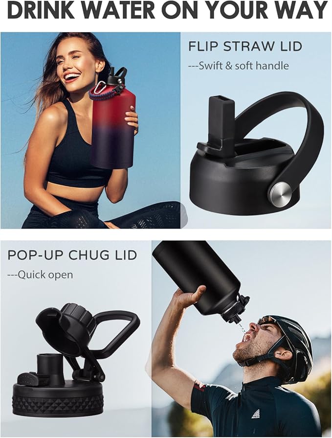 - 2 LEAKPROOF LIDS OPTIONS: This stainless steel water bottles with STRAW LID and AUTO SPOUT LID, both BPA-free, leak-proof and one-hand control design, great car must have things! The pop-up spout lid for easy drinking and seals shut for no leaks when you're on the go. The straw lid makes it easy to enjoy spill-proof sips, and package come with a alternative straw & a straw brush for easy cleaning.