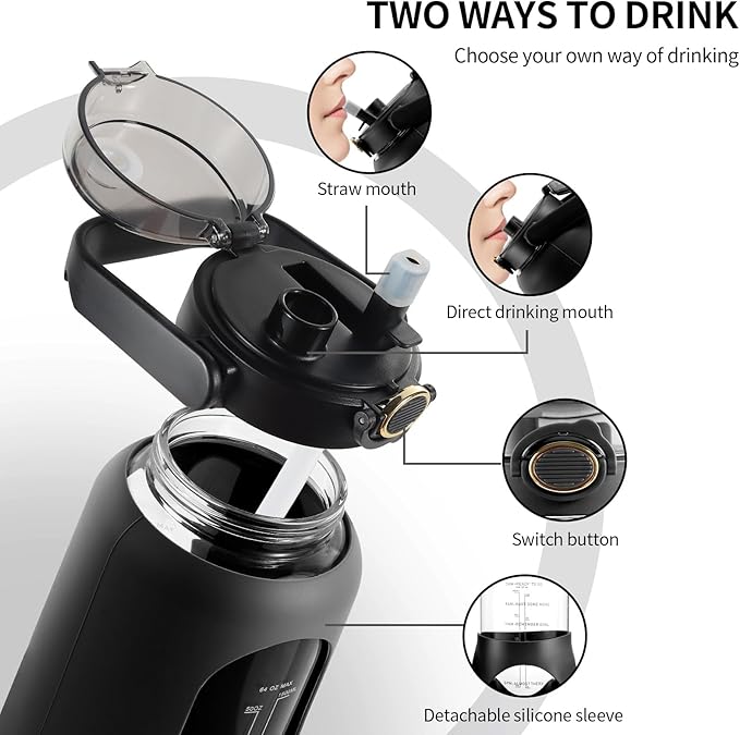 - Straw Spout: Our 64 oz glass water bottle is available in various colors to suit your preferences and needs. To take a sip, simply unlock the cap and drink from the spout. When it's time to refill your bottle with water and ice, you can remove the entire lid to reveal the wide mouth, making it easy to add large ice cubes and fruit.