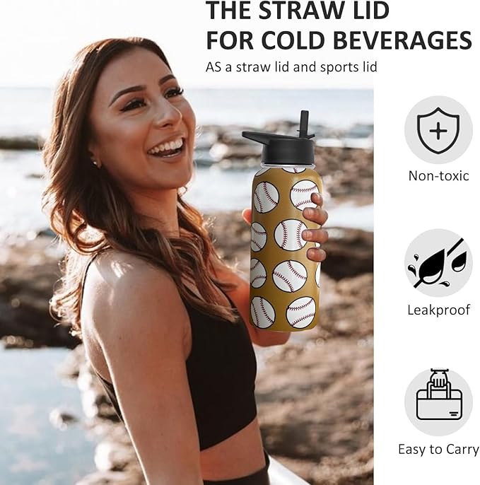 32 oz Baseball Water Bottle Insulated Vacuum Stainless Steel Sports Water Bottle with 2 Lids (Straw and Spout Lid) for Gym Camping Hiking
