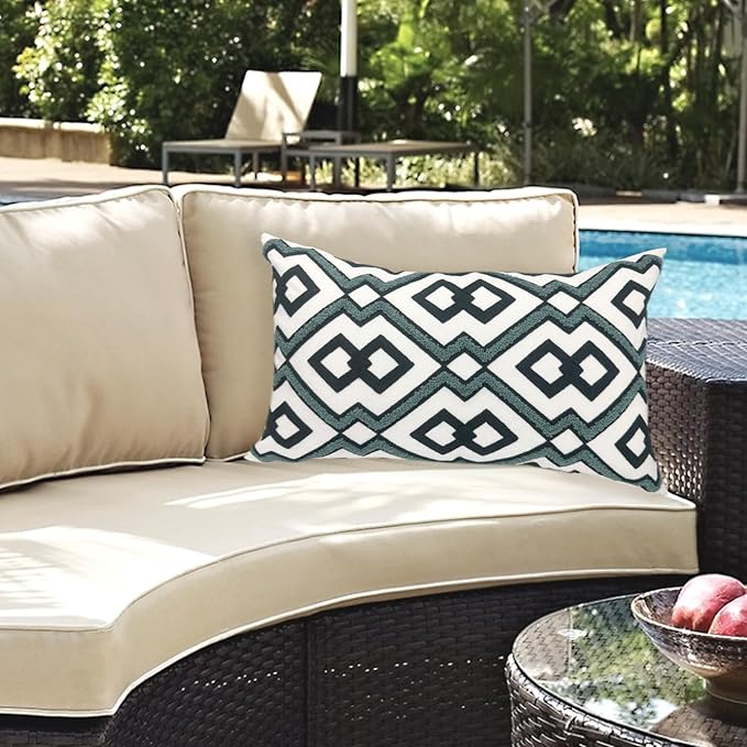 Alysheer Embroidered Lumbar Decorative Throw Pillow Cover 12"x 20", Classic Boho Geometric Embroidery Pattern Cotton Rectangular Cushion Case for Sofa Couch Living Room Bedroom (Navy Aqua)