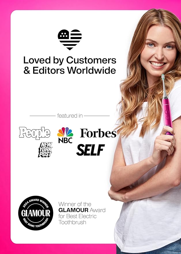- What's in the Box – 1 Electric Pink Smart Toothbrush, 8 DuPont brush heads with protective caps to keep your brush heads clean, 1 custom travel case, user manual, warranty card