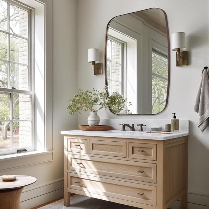 - Excellent Performance: A sleek, modern stainless steel metal frame surrounds a unique oblong mirror; sets it apart from traditional oval or rectangular mirrors; brushed bronze finish complements your bathroom; adds light and space to the room