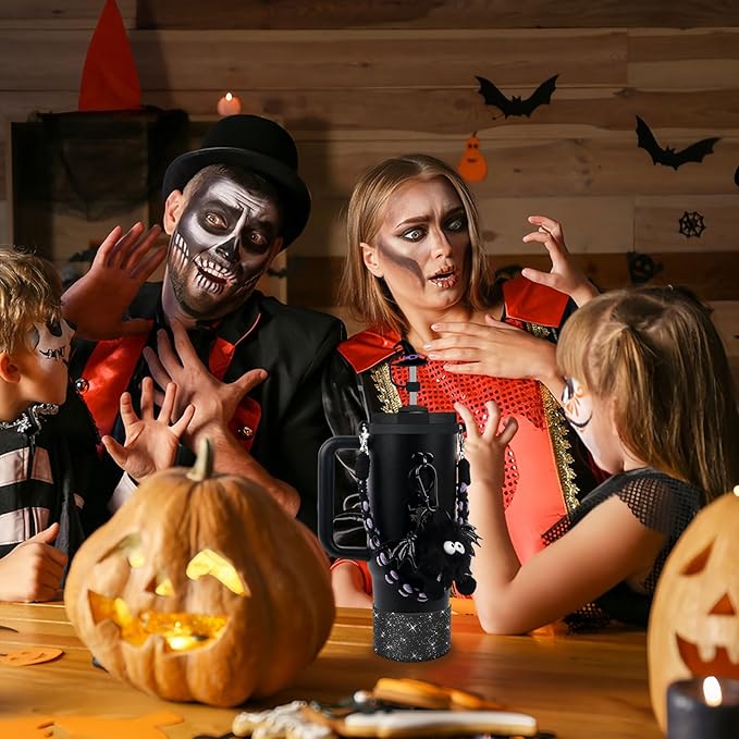 BELSITA Stanley Cup Accessories Set, Black Bird Chain Braided Design Water Bottle Handle Strap, Black Glitter Silicone Stanley Cup Boot, Stanley Charms for Stanley Cup 30/40oz Tumble (Halloween 2)