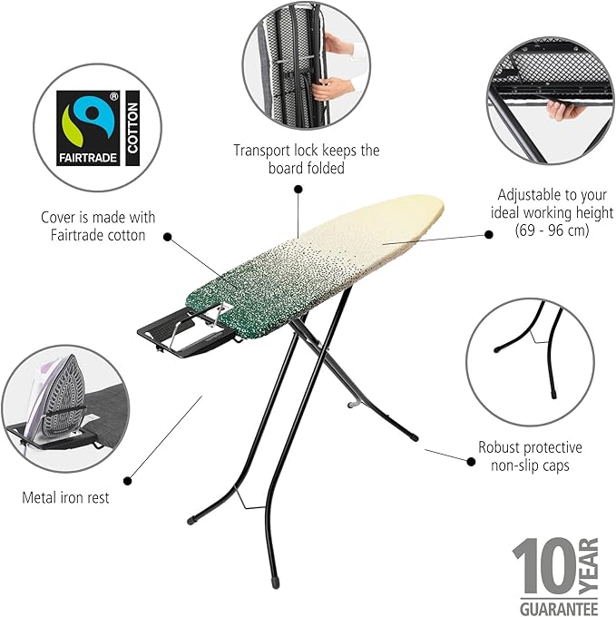- High-Quality Materials and Design: Features a 100% Fairtrade cotton cover for a smooth, durable ironing surface, supported by a resilient foam layer for added comfort; The Stretch-System ensures a perfect, crease-free fit for efficient ironing