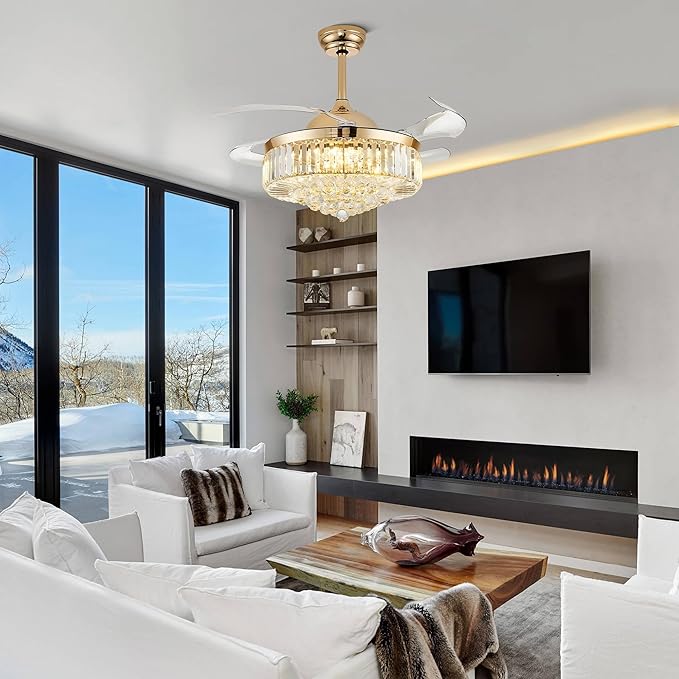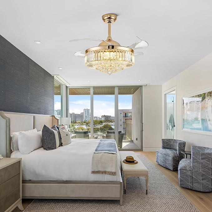 42'' Gold Crystal Chandelier Fan Fandelier Retractable Ceiling Fan with Light and Remote, Invisible Fandelier Ceiling Fan with Light for Bedroom Living Room(crystal-gold)