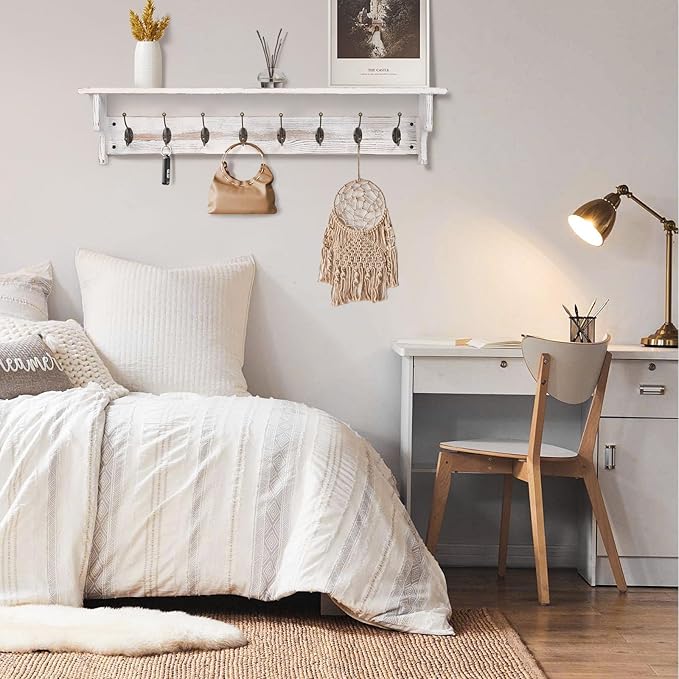 - Multi-function Shelf with Hooks: The white wall coat rack wall mount with 8 metal hooks, your clothes, hats, keys, towels, etc., can be easily hung up, it is equipped with a floating shelf to put your various small ornaments, add storage space