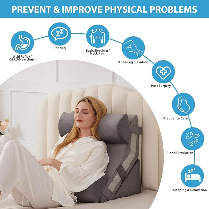 - 【Comprehensive Health Improvement】Our elevated pillow is designed to enhance sleeping quality and overall well-being across various health needs. It effectively alleviates pain in the shoulders, neck, back, spine, and legs as a body positioner. Moreover, the incline pillow aids in post surgery recovery, relieves symptoms of acid reflux, GERD, and heartburn, addresses snoring, promote blood circulation and breathing, and provides pregnancy support.