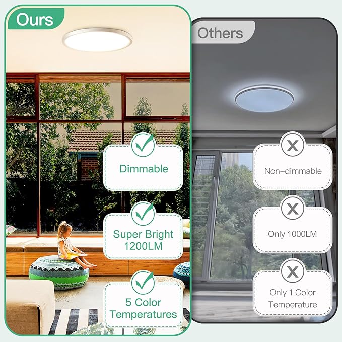 - Cost-Effective LED Ceiling Lights - Consuming only 12 watts of energy, this ceiling light flush mount is equivalent to 120W traditional incandescent bulbs. Illuminate your space with ease as this flush ceiling light produces 1200lm brightness. It also excels in heat dissipation, ensuring longevity with over 25,000 hours of radiant glow. Say goodbye to frequent bulb changes and hello to immediate savings of up to 90% on your lighting bill. Upgrade your lighting experience today!