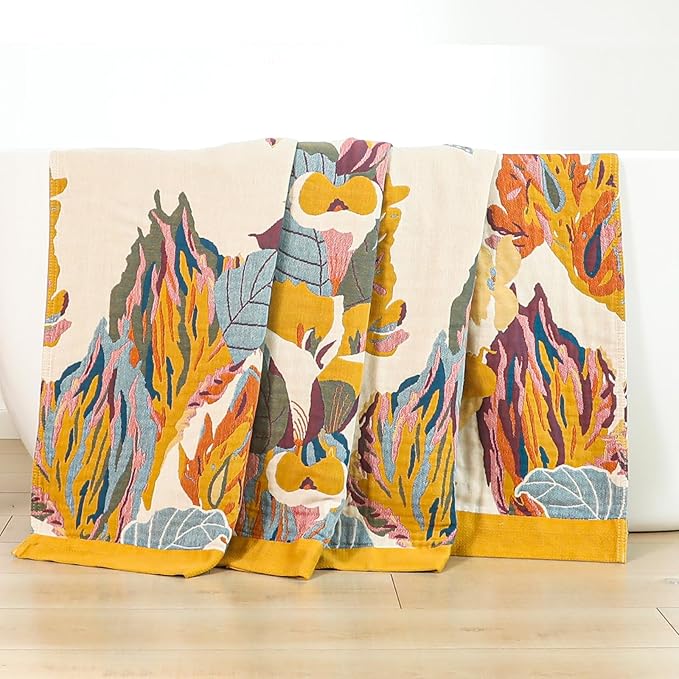 Boho Throw Blanket for Bed,100% Cotton Breathable Muslin Soft Throw, Fall Bed Throw Blanket Floral Bird Butterfly Printed Decor Large Blankets,80"×90" Rustic Farmhouse Throw for Sofa Couch Chair