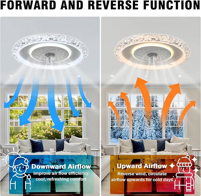 - Reversible Motor And Quiet Fan: The DC motor of this ceiling fan light offers powerful airflow while no noise. It runs downdraft cool airflow during summer and updraft airflow during winter to aid in rotating warm air, promoting air circulation and saving energy.