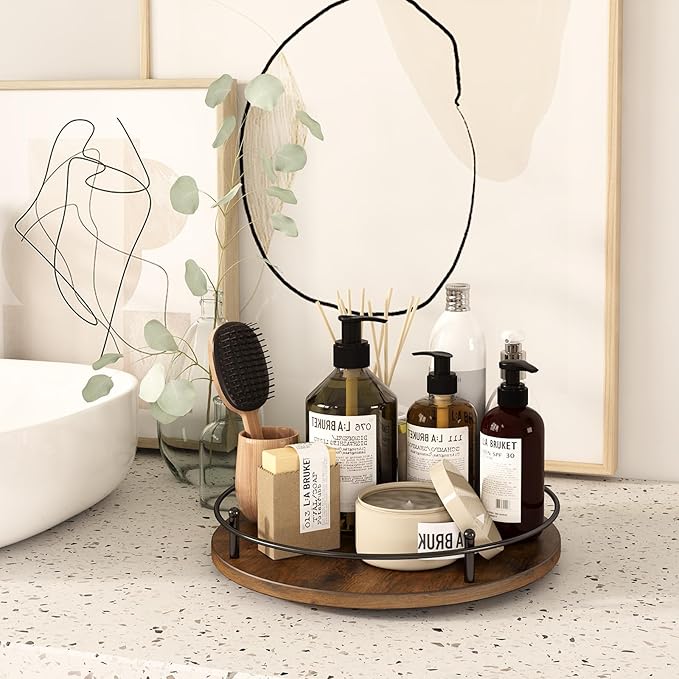 - 【Vintage Material】This Round Wooden Lazy Susan made with handmade craftsmanship.It is made of carbon steel and high-density wood fiberboard is very strong and durable, not easy to wear and tear, no odor.It has a finely textured surface that creates a unique vintage look.