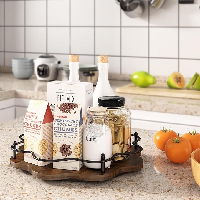 - 【Vintage Material】This Round Wooden Lazy Susan made with handmade craftsmanship.It is made of carbon steel and high-density wood fiberboard is very strong and durable, not easy to wear and tear, no odor.It has a finely textured surface that creates a unique vintage look.
