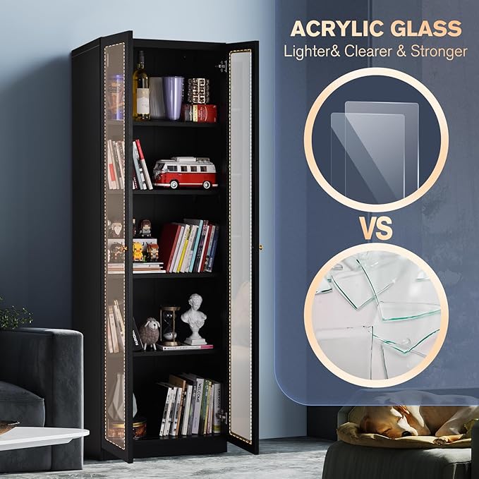 - Display Cabinet with Acrylic Doors: The 2 doors of this curio cabinets with Acrylic, so that the items inside are clear at a glance, easier and fast for you to find files, medicine,et. Warm Tips: Acrylic doors come with a peel-off protector.