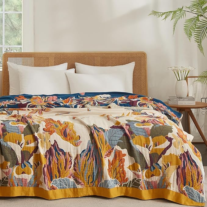Boho Throw Blanket for Couch Sofa Bed, 100% Cotton Woven Quilt with Tassel 60”x80”, Super Soft Muslin Blanket with Floral Printed, Decorative Reversible Bed Blanket/Cover for All Seasons